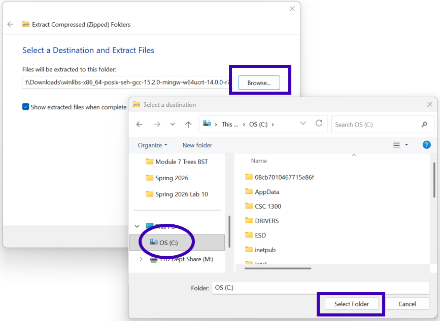 Right-click and select Extract All. Click Browse to select your C: drive and then click the Select Folder button.