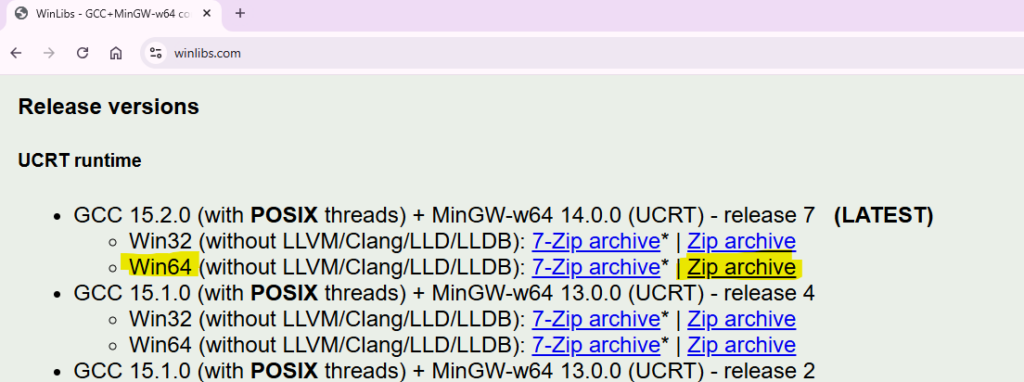 Go to https://winlibs.com. Then, scroll down until you see the Release versions and then choose the LATEST version, which should be at the top (GCC 15.1.0 as of 6/5/2025). I recommend choosing to download the Zip archive for Win64, which is highlighted below. Note: the LATEST version may be different from the time that I made this document.